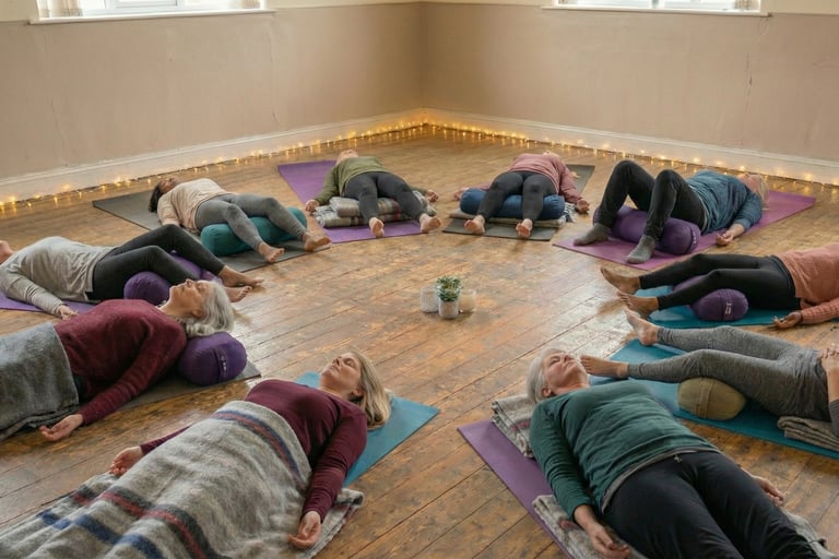 Restorative relaxation practices, including Yoga Nidra and guided meditation tailored for peri/menopause